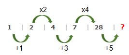 זוהי סדרה משולבת. בסדרה זו יש לבצע פעולות חיבור וכפל לסירוגין. בכל מעבר המספר הכופל או המחבר גדל ב-1.