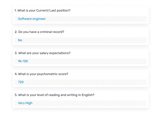 אחד השלבים הראשונים בתהליך הגיוס הוא שאלון קצר, שכולל שאלות חיוניות שבדרך כלל נשאלות במהלך הראיונות הראשוניים, כגון שנות ניסיון, ציפיות שכר ופרטים נוספים ספציפיים לתפקיד. כלי סינון ראשוני זה חוסך לכם ולמועמדים ראיונות טלפוניים מיותרים ומאפשר לכם להעריך באופן מיידי אם המועמדים עומדים בדרישות הבסיסיות של התפקיד. תוכלו להתאים את השאלון על ידי בחירה מתוך מאגר השאלות של המערכת או על ידי הוספת שאלות מותאמות משלכם.